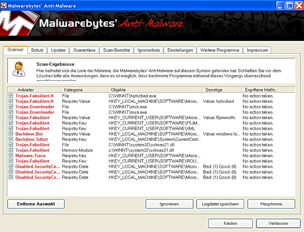 Heute war es einmal wieder soweit, ich wurde mal wieder zu einem nicht mehr startenden Rechner gerufen, trotz Avast Antivirus (der hat zumindest einmal Angeschlagen und eine sxl.exe in den Container gesteckt) ging hier nichts mehr. Nach einigem hin und her konnte ich die Freeware Version von Malwarebytes Anti-Malware installieren. Im ersten Scan-Durchgang fand er 10 „böse Teile“ und nach dem Neustart des Rechners und eine Online-Update der Anti Maleware Software wurden weitere 16 Elemente gefunden und entfernt. In der dritten Runde fand er dann noch einmal 4 Elemente. Danach war der Rechner wieder sauber. Ein paar Programme liefen nicht nicht mehr, doch nach der Neuinstallation der beschädigten Software waren alle Probleme gelöst.