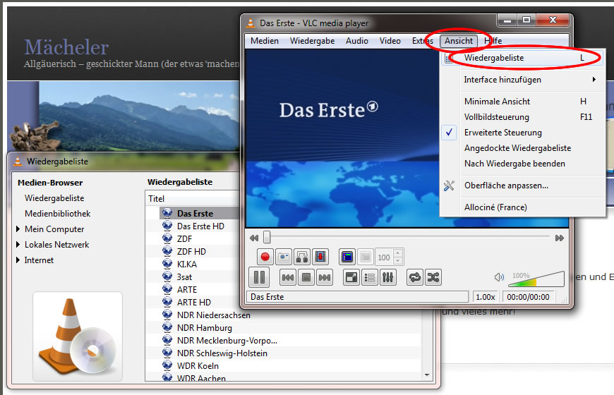 Unter „Ansicht“ findet man die „Wiedergabe Liste“ – Sender hier auswählen. - Eine noch ausführlichere Playliste findet ihr unter: http://grinch.itg-em.de/entertain/faq/allgemein/multicastadressliste/