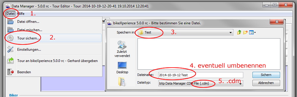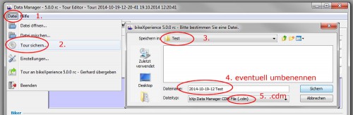 „Datei“ – „Tour sichern“ den Datensatz eventuell umbenennen und als .cmd File speichern