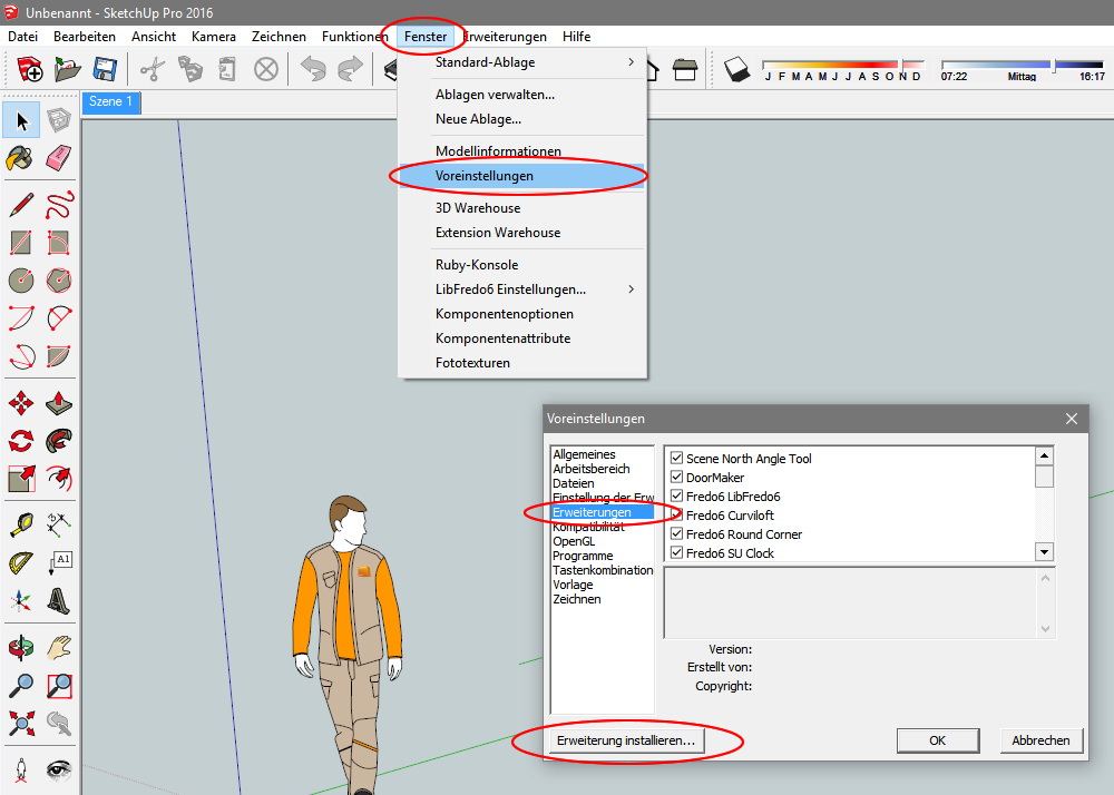Bei mir erscheint beim Fenster Voreinstellungen der Button „Erweiterung Installieren“ nicht, können Sie mir weiterhelfen ? Es ist Sketchup Pro8 Lizenziert keine Freeversion