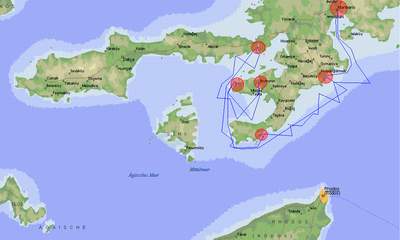 Das Anklicken der roten Kreise führt Sie zu den Ortsbeschreibungen.Gelbe Textmarkierungen öffnen einen Kartenausschnitt..Fotos anklicken zum vergrößern.